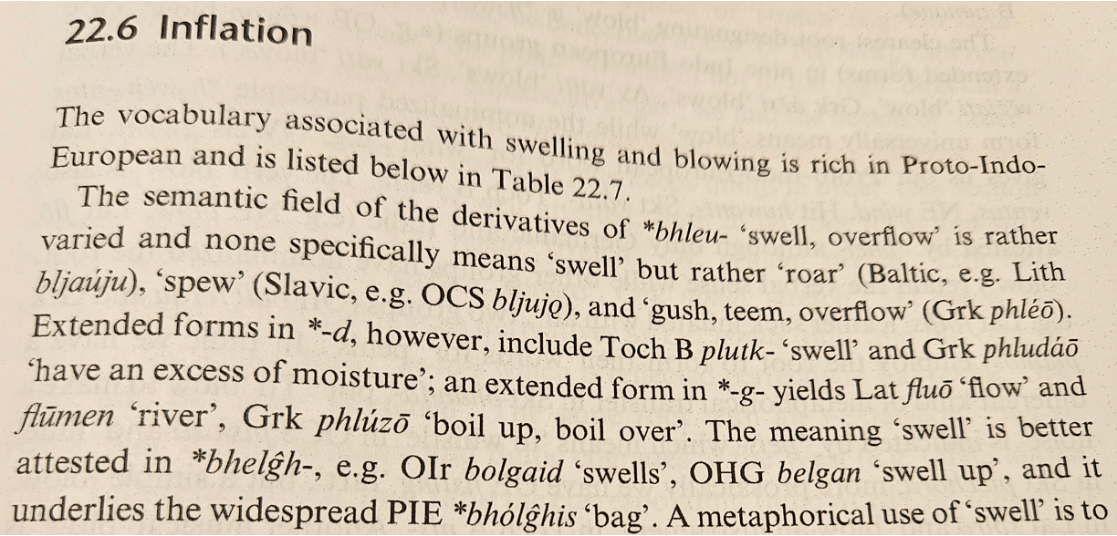 부풀다(swell)을 뜻하는 인도유럽어가 'bhleu'라는 소리가 들어가 있다고 명시했다. 우리말로 음역 하면 '부루, 블루,브루,불어' 등의 소리 범주안에 들어온다. 핵심 소리는 '블, 불'이다. 영락없이 우리말 '불다, 부은, 부르트다, 불어난' 등과 깊이 관련된다. 더 우리말로 밖에 해석할 수 없는 부문이 "none specifically means swell but rather roar" 문장이다. "bhleu'가 특별히 '불다(swell)'의 뜻에 그치지 않고 오히려 '부르다(roar)로도 쓰인다'는 점을 강조하기 때문이다. 'roar'는 '부르짖다, 고함치다, 으르렁거리다' 뜻이다. 영국 옥스퍼드는 이 부문을 정확히 파악을 못했다. 왜 swell과 roar의 뜻이 같은 뿌리 소리인지...